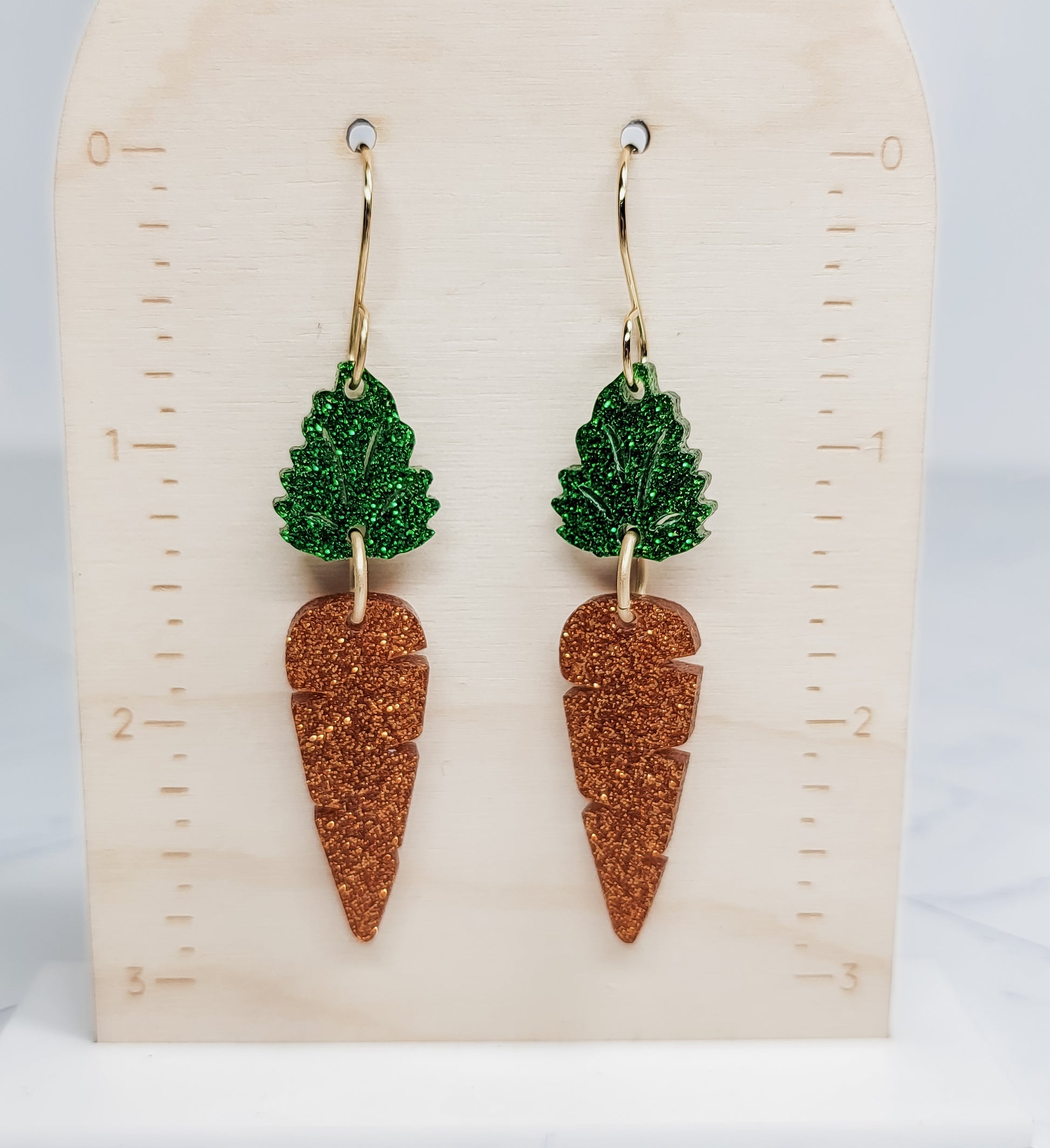 Add a touch of fun to your spring wardrobe with our glitter carrot acrylic earrings! These playful earrings feature a glittery carrot design that will bring a pop of color and joy to any outfit. Made from lightweight acrylic, these earrings are comfortable to wear all day long. Whether you're dressing up for a special occasion or just adding some sparkle to your everyday look, these earrings are sure to bring a smile to your face.